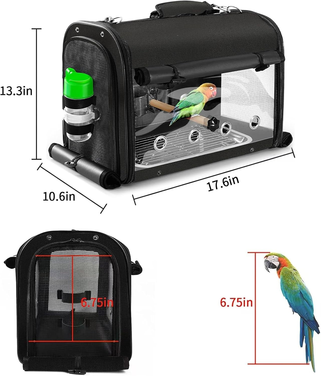 - 【SIZE & SERVICE】 17.3” L x 10.6” W x 13.3” H. Suertree bird carrier size is suitable for most pet birds. Suggested for Cockatiels, Conures, Quakers, Caciques, Mini Macaws, Parakeet, Lories, and other similar size parrots. If you have any questions, please feel free to contact us. We provide 24h service.