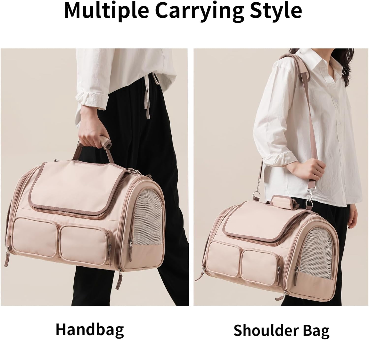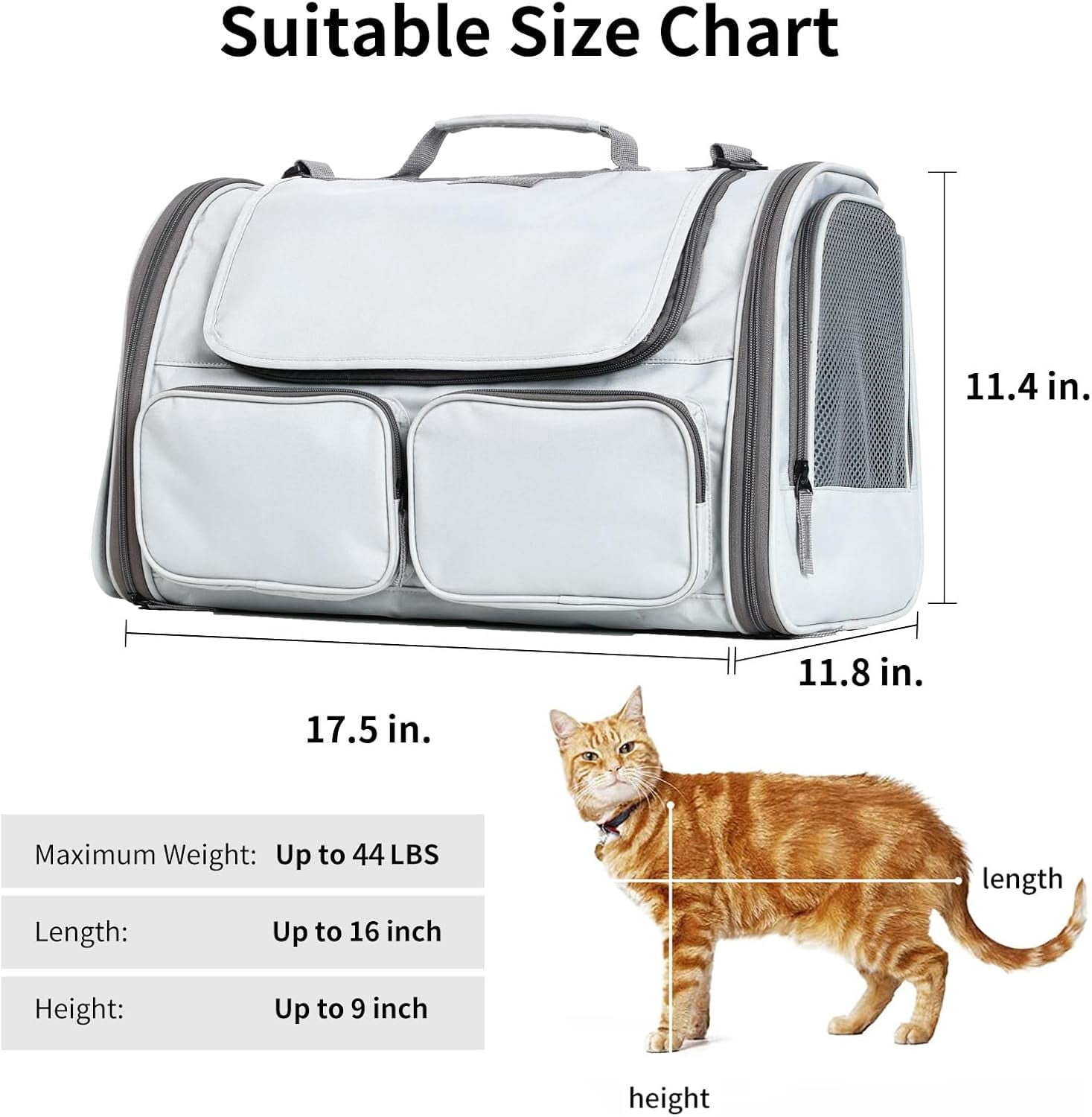 Pet Carrier Measuring Guidelines Before Purchase – The pet travel carrier is designed for small and medium pets within 17.5″L x 11.8″W x 11.4″H and 15 lbs. Please do not choose your carrier based on weight, recommanded reference your pet’s length and height in selecting a carrier size.