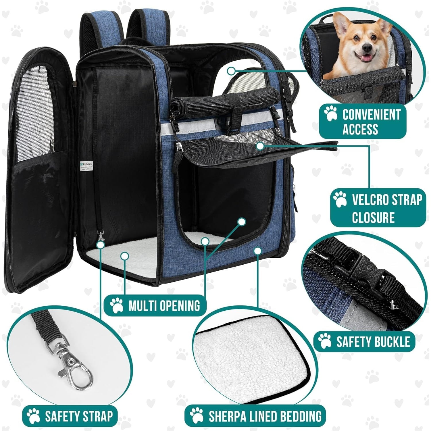 - VENTILATED CAT CARRIER BACKPACK: Our pet backpack has well ventilated design for optimal airflow, two-way entry for easy access, zip up mesh window for more headroom and visibility, and thick, cozy sherpa lined bedding so your pet can rest and relax. This dog backpack carrier is reinforced with firm structure, making this the perfect weekend dog backpack for hiking, camping, dog walking, pet traveling, road trip, airplane travel.”