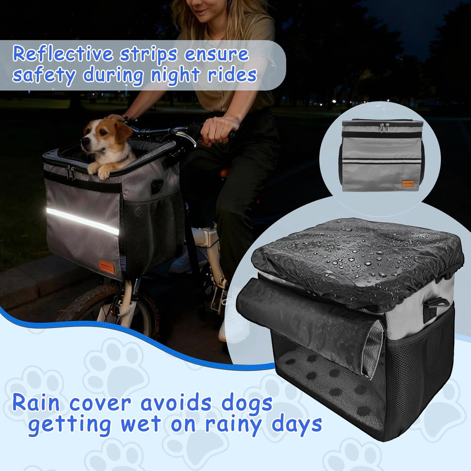- Breathable & Reflective Design: The dog basket for bike has breathable mesh fabric on the top and front.The front has a curtain to block light, and it is equipped with reflective strips to ensure reliability during night rides.