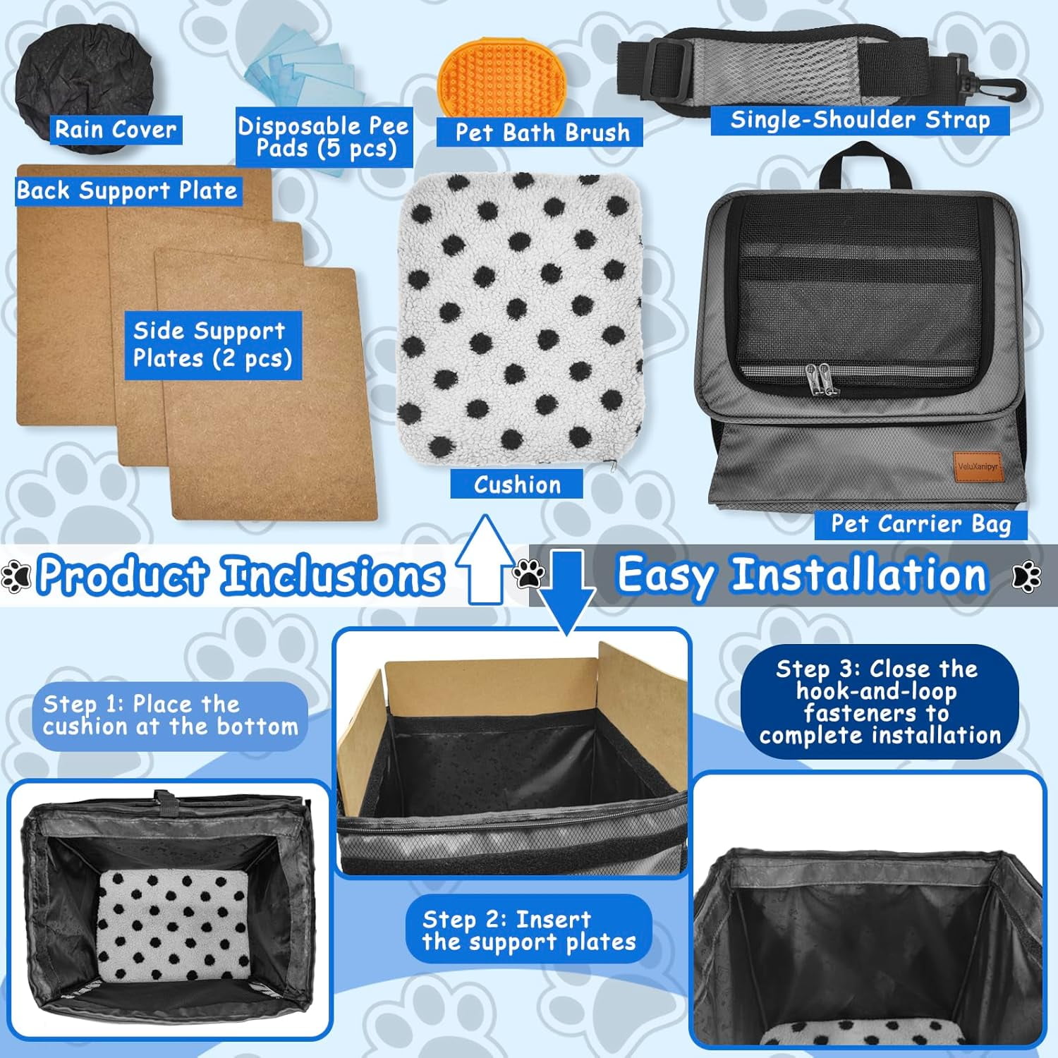- & Wear-Resistant Material: The dog bike carrier is made of Oxford cloth, which is wear-resistant and easy to clean. It comes with 5 disposable pee pads and a pet bath brush to keep your carrier and pet bright and clean.