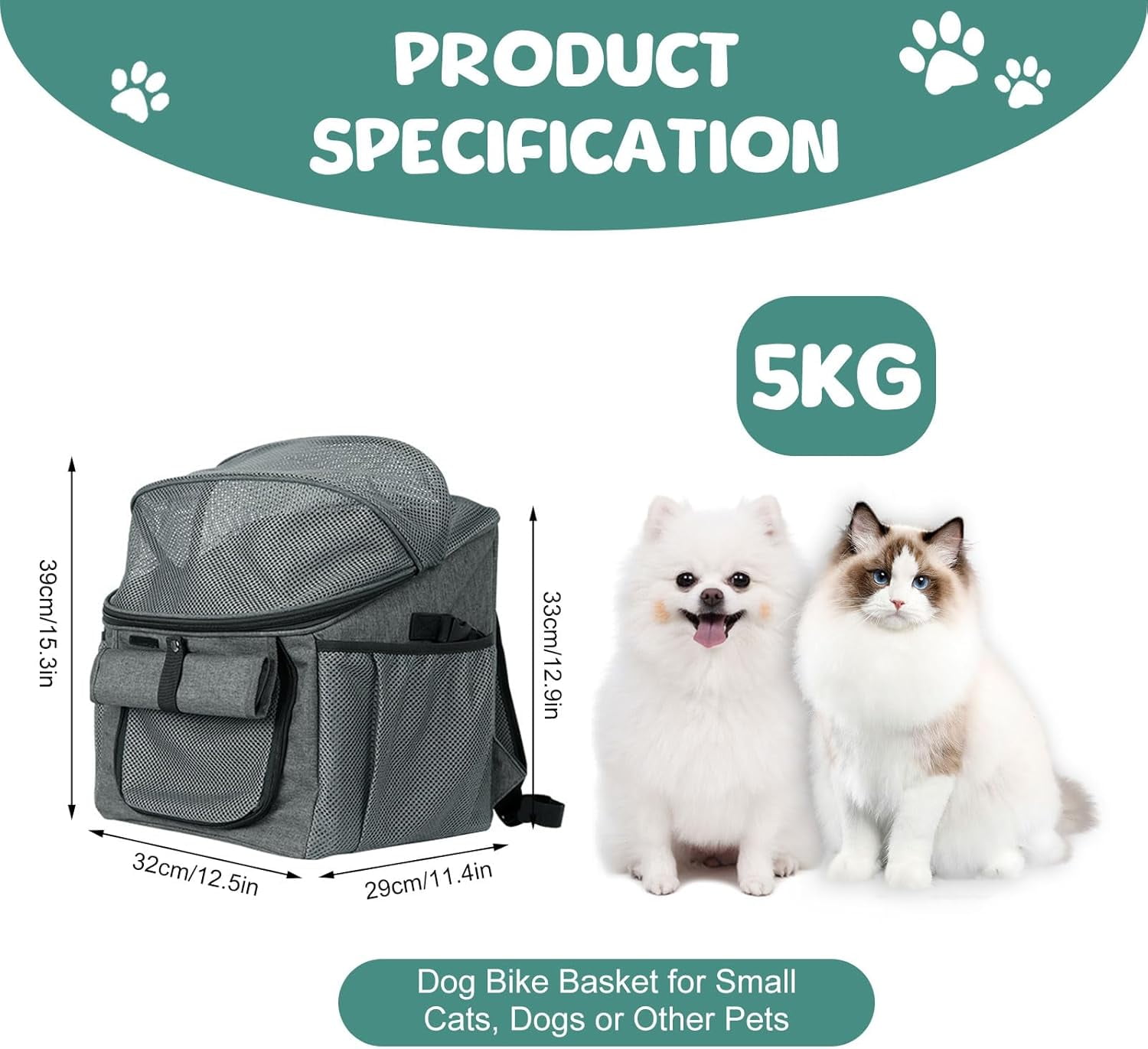 - SAFE AND COMFORTABLE DOG BIKE BASKET: Both sides of the bike pet carrier are equipped with sturdy frame panels and sturdy bottom support panels, providing strong support for your pet, with dimensions of 39cm/15.3in×32cm/12.5in×29cm/11.4in×33cm/12.9in, maximum load capacity is 5 kg.In addition, the internal safety rope clip attaches to the dog’s harness to prevent your pet from jumping out of the bag; the washable pad on the bottom makes your pet more comfortable in the pet bike basket.