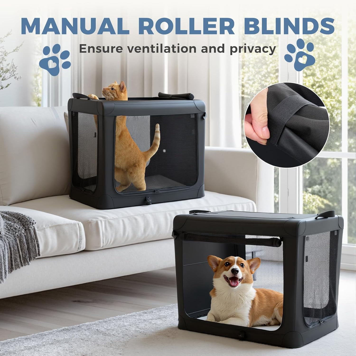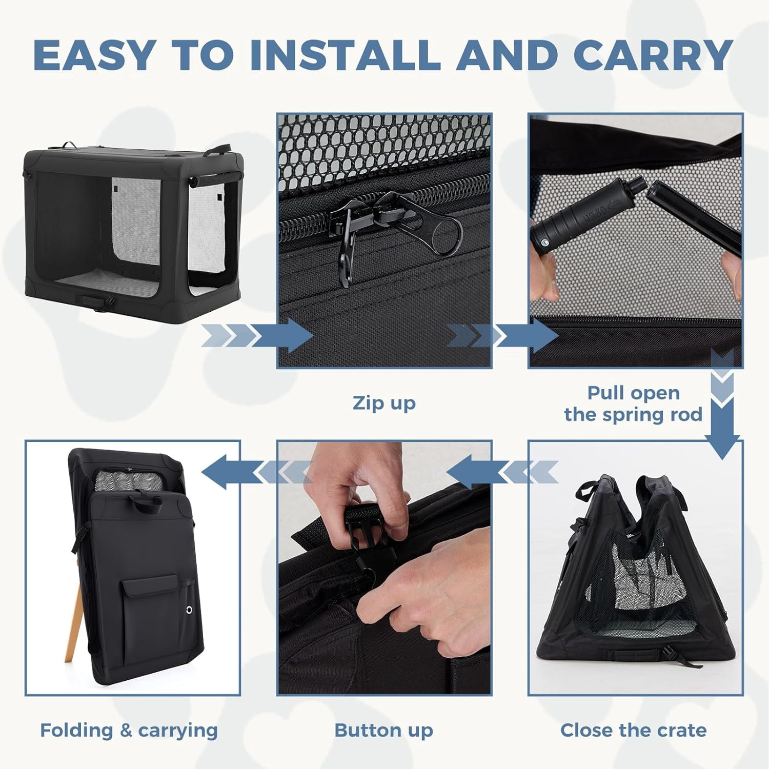 - Portable & Foldable: The portable dog travel crate adopts a high-strength steel frame and flexible connection design, which can be quickly folded into a flat shape and easily placed in the trunk of a car or a corner of the home.