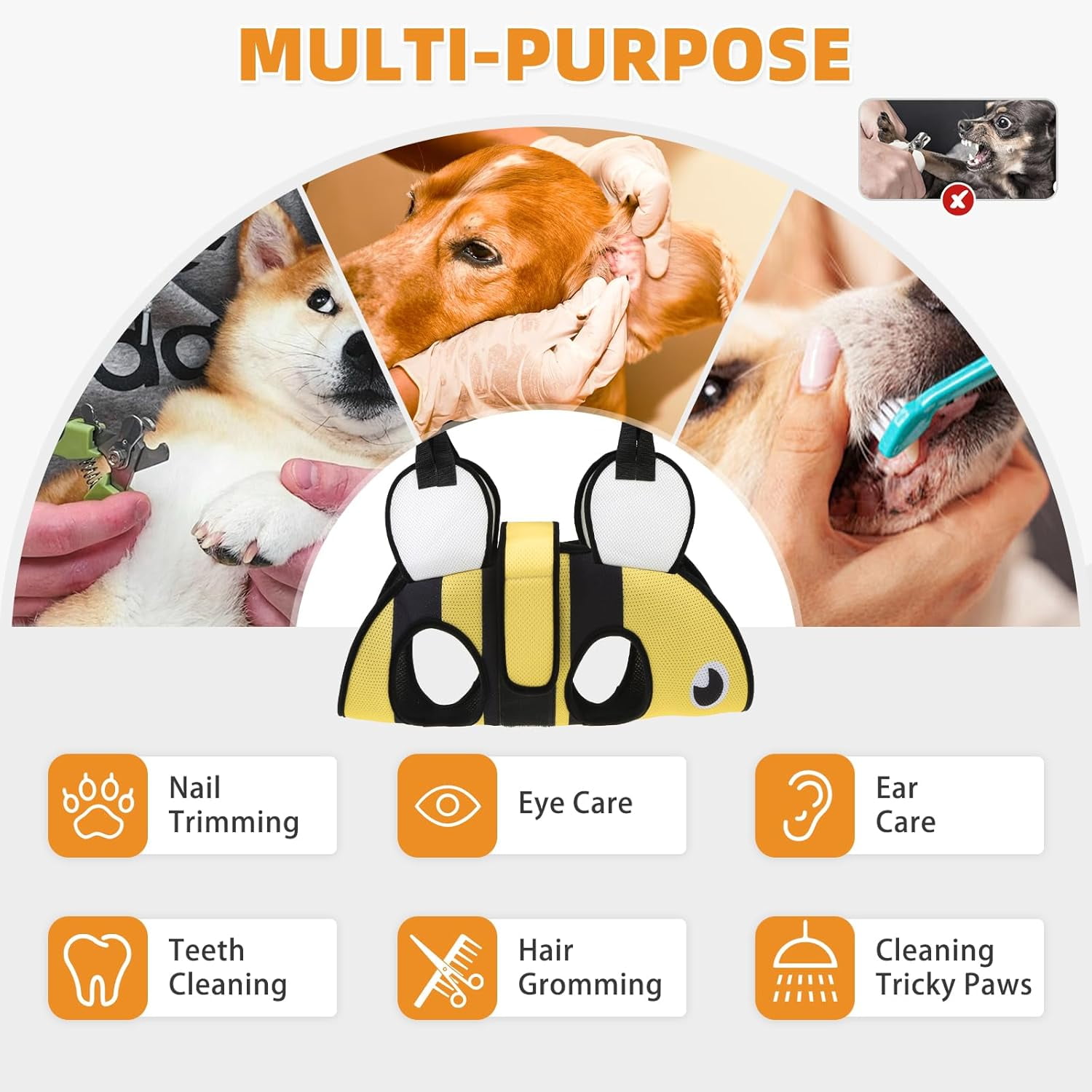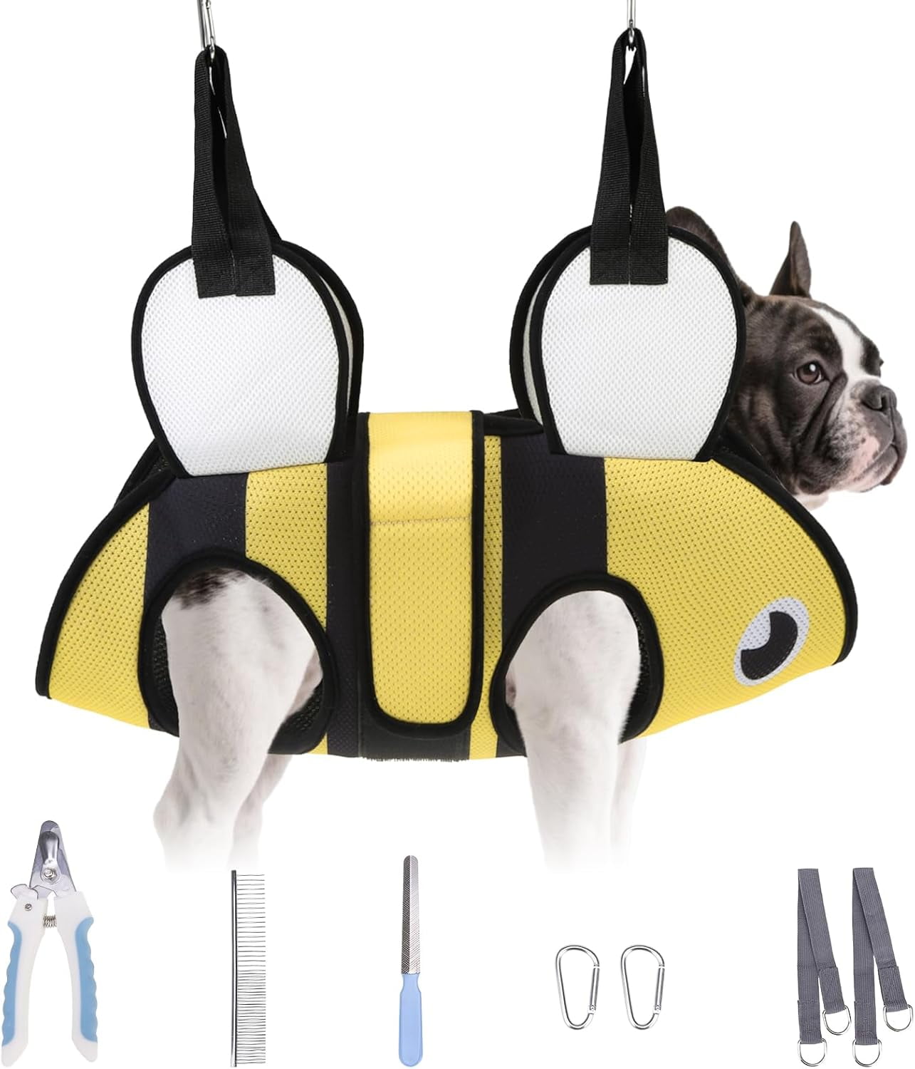 PERFECT PET GROOMING SET — This set includes one shark design hanging harness, one nail clipper, one nail file, one steel comb, and two carabiners with two durable straps. The nail clippers are equipped with a safety guard blade and a one-click sliding locking function to prevent damage to your pet’s nails from excessive trimming. When not in use, the blades stay closed to ensure safety. This grooming kit simplifies pet care at home. 3D Mesh Structure Design — This dog nail trimming hammock features a breathable and flexible 9D mesh structure, ensuring your pet’s comfort. The thickened edges around the holes help reduce friction on your pet’s legs, making them more relaxed during grooming. Additionally, this product is easy to clean and can be washed by hand or in the machine. Easy to use and highly functional — Our hammocks and related accessories are easy to use and highly functional. They enable you to care for your puppy at home, providing the same services you would find at a pet hospital, such as nail trimming, eye and ear care, and the application of lotions. With our products, you won’t have to worry about grooming your pet or spending extra time and money on professional services. You can confidently provide the necessary care for your puppy right at home Enhanced Security — The pet grooming hammock comes with adjustable straps that securely attach to the back of your pet, ensuring a perfect fit. The heavy-duty clamps provide excellent load-bearing capacity and are more durable, stronger, and safer than standard S-shaped hooks. Additionally, you can rest assured that there is no risk of your pet escaping or the straps breaking, eliminating any potential danger. Choose the Right Size — We offer three sizes: XS, S, and M. These sizes are designed to accommodate different types of dogs. Before making a purchase, please refer to the details page for the data and size chart to find the best fit for your pet.