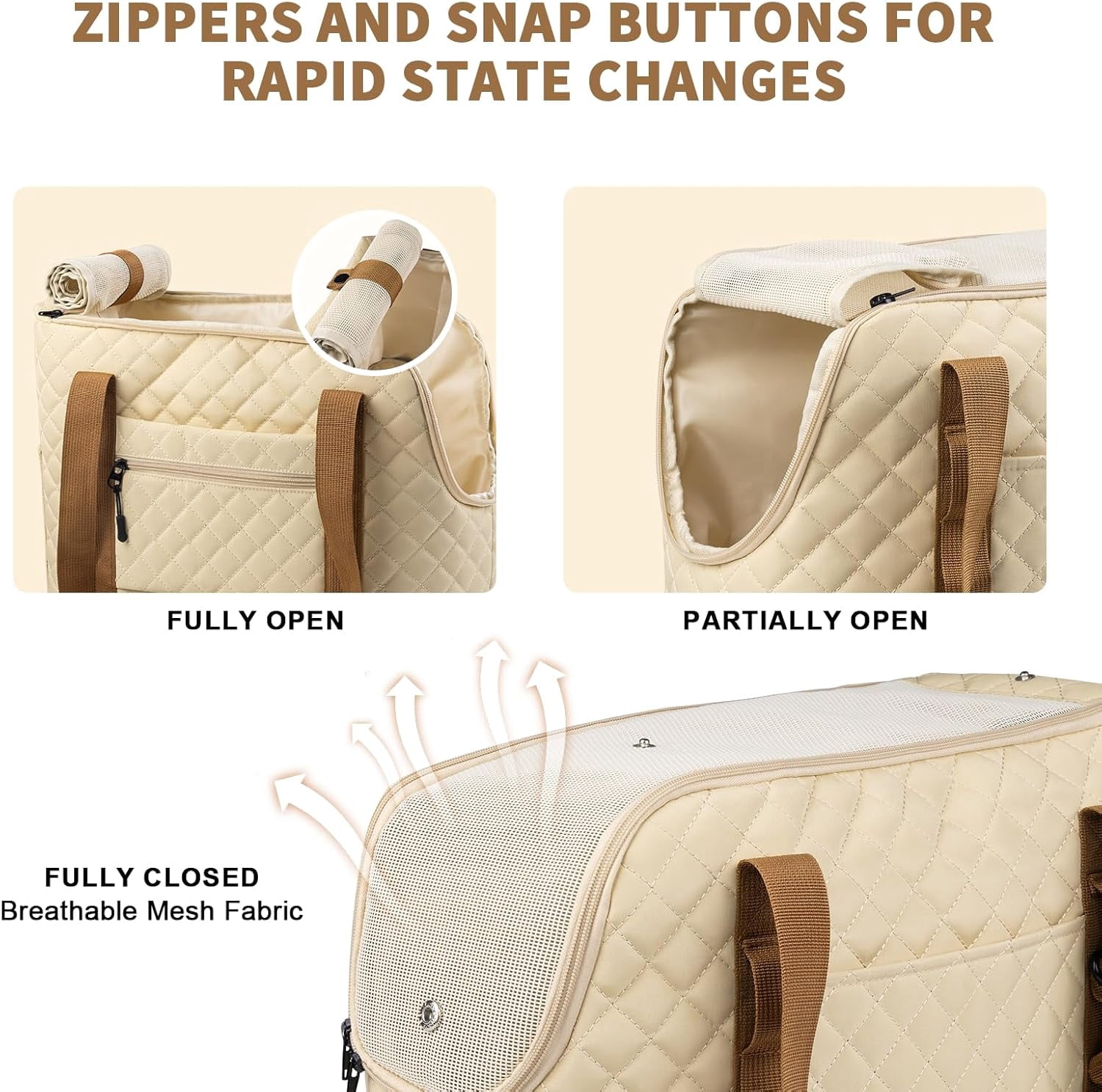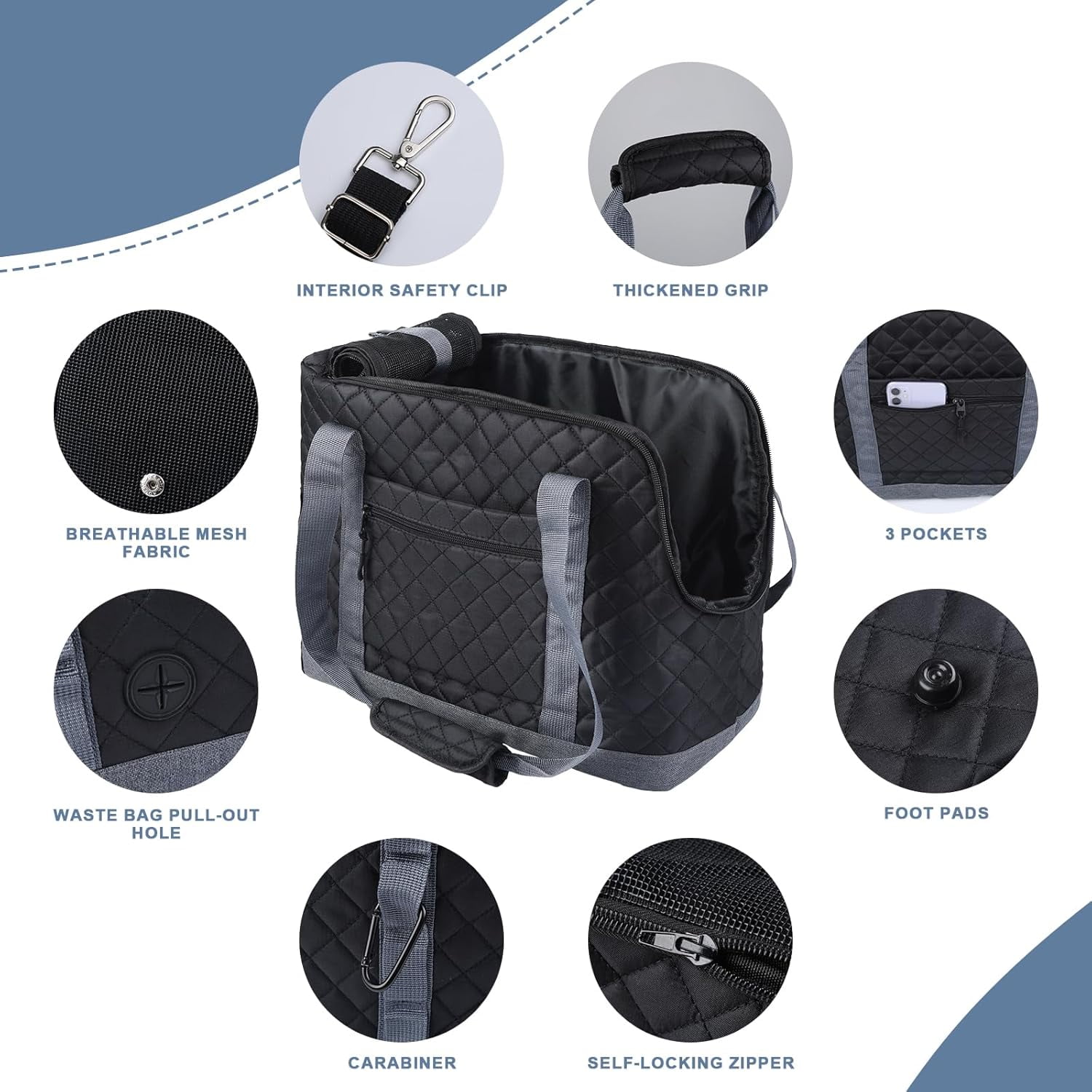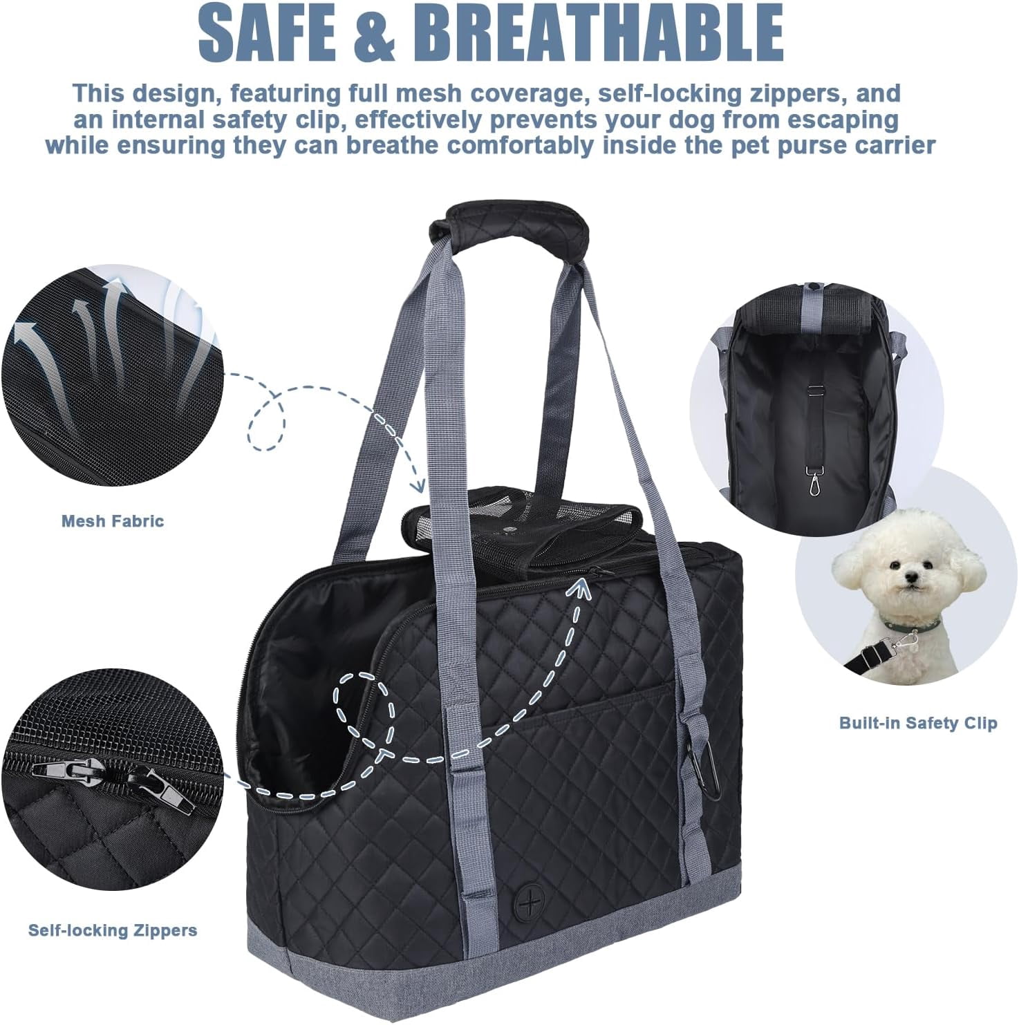 【Safe & Comfortable】Our dog carrier purse is made of high-quality quilted fabric, which is sturdy and durable. This pet carrier is equipped with a removable dual-sided bottom board (fluffy fabric and clothing fabric), making it suitable for all seasons and provides stable support. There is a built-in safety rope to prevent pets from escaping from the bag. The top features a breathable mesh, allowing pets to breathe comfortably, providing a safe and comfortable travel environment for your pet.