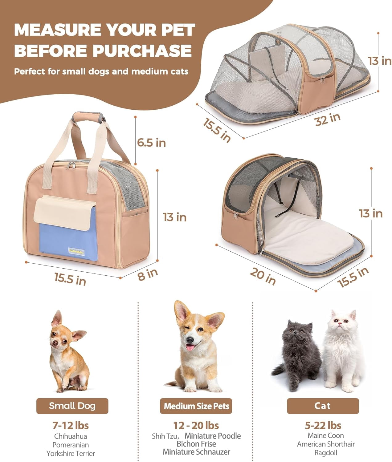 Spacious and Expandable Design: Dual-sided expansion from 15.5″×8″×13″ (compact) to 32″×13″×14″ (spacious) provides adjustable space for pets up to 22 lbs. Ultra-lightweight at 1.8 lbs (810g), it transitions seamlessly from daily commutes to hiking adventures. (When selecting a carrier, please do not rely solely on your pet’s weight. Measure their height, length, and width to ensure a comfortable fit.)