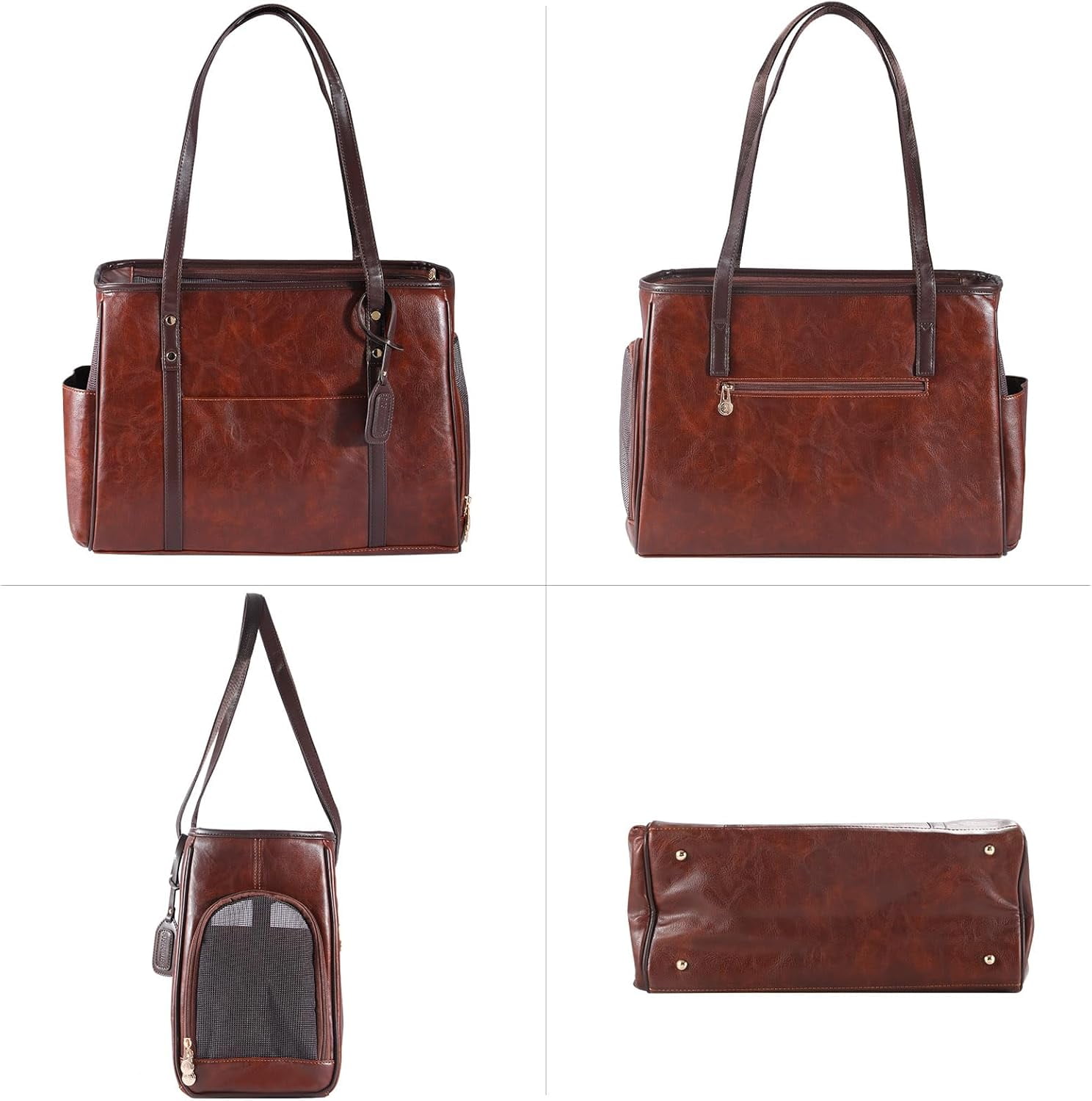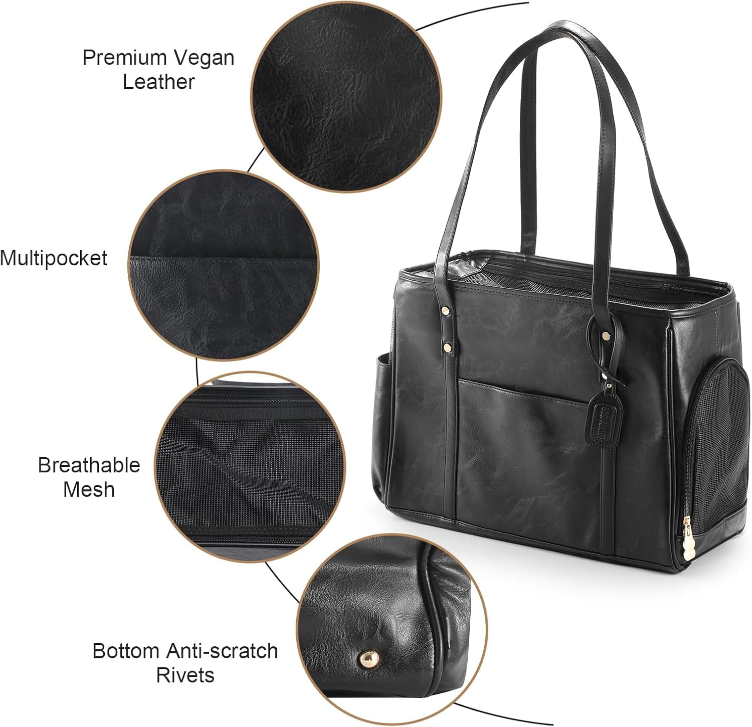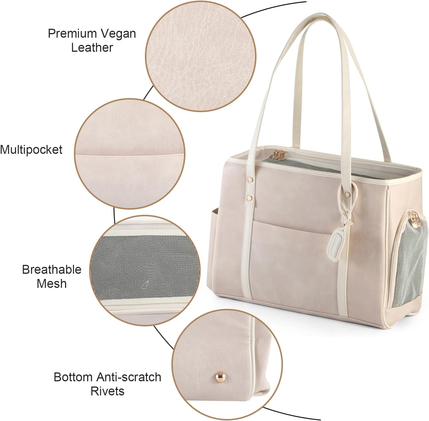 【Sturdy & Safe Construction】Crafted with durable materials(Vegan Leather), this dog carrier features a reinforced frame for added safety. The mesh windows provide excellent ventilation and visibility, keeping your pet calm and comfortable.