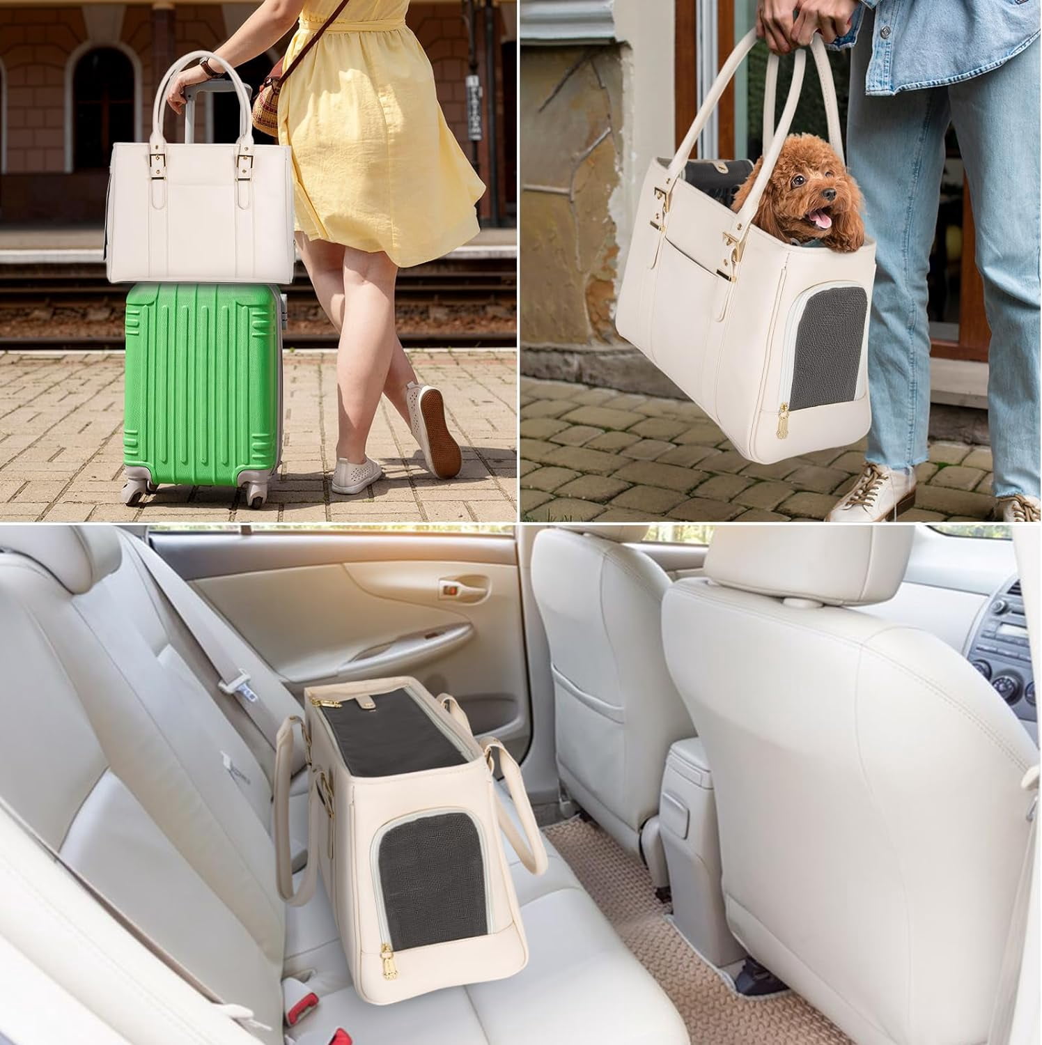 Fashion Pet Carrier Dog Purse Cat Bag Soft-Sided Carriers Travel Airline Approved, Stylish Leather Tote Handbag for Small Animal Puppy Kitten (White)