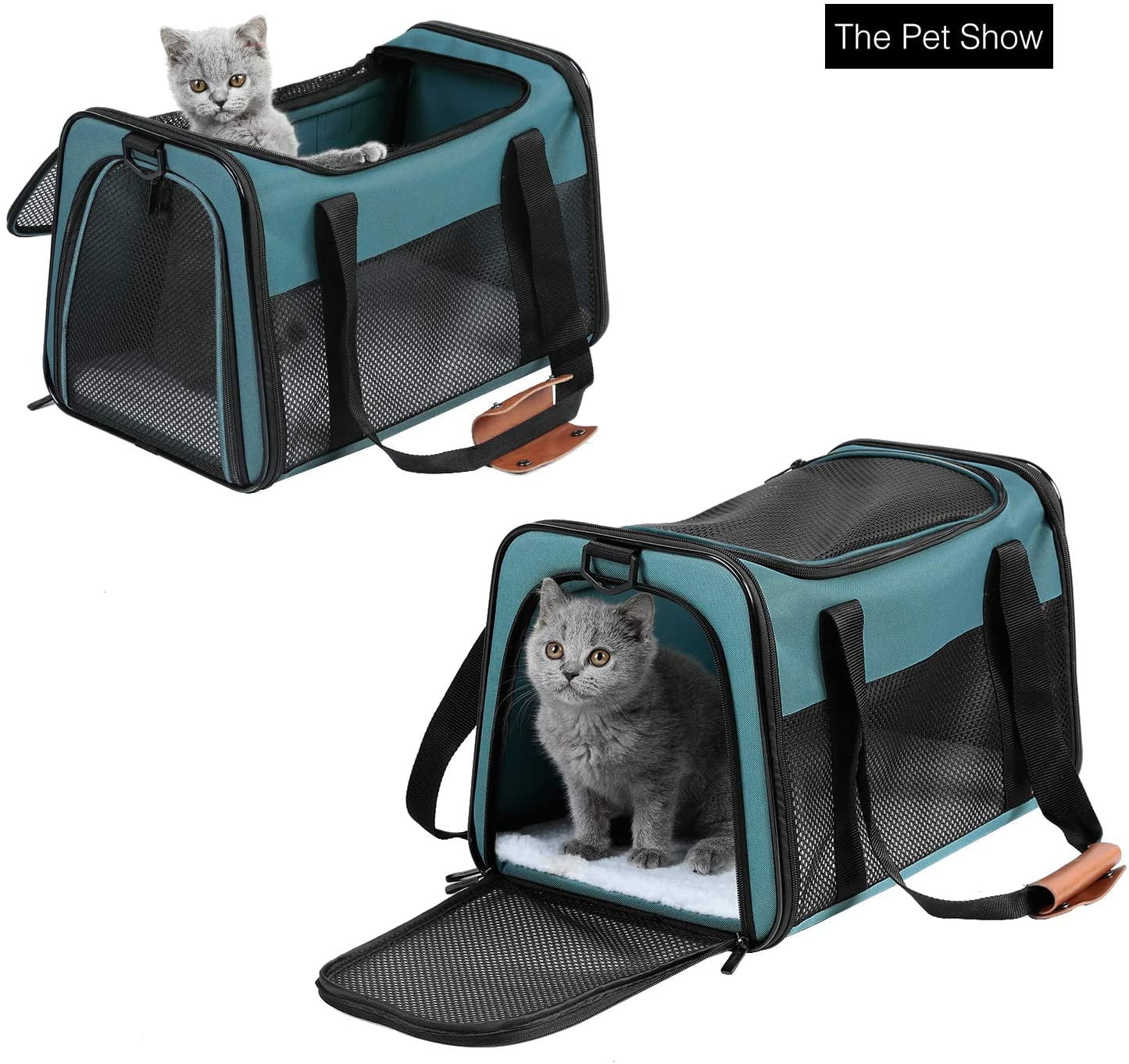 - Airline-approved pet carrier suitable for cats and small dogs up to 15 lbs