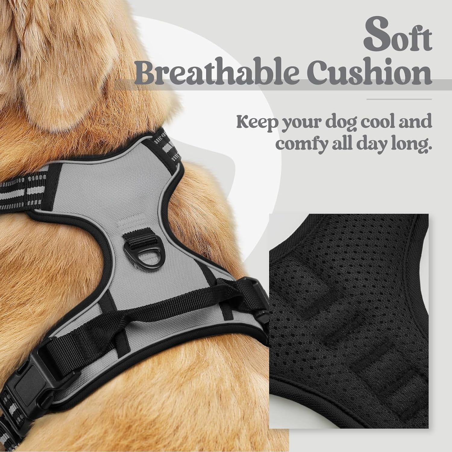 - Safe and Comfortable – Your dog will enjoy the daily walk in this comfort dog harness! Made of sturdy nylon oxford and padded with soft cushion to protect your dog’s skin. Breathable air mesh keeps your dog cool during outdoor activities. Super bright reflective strips ensure a safe walk both day and night.