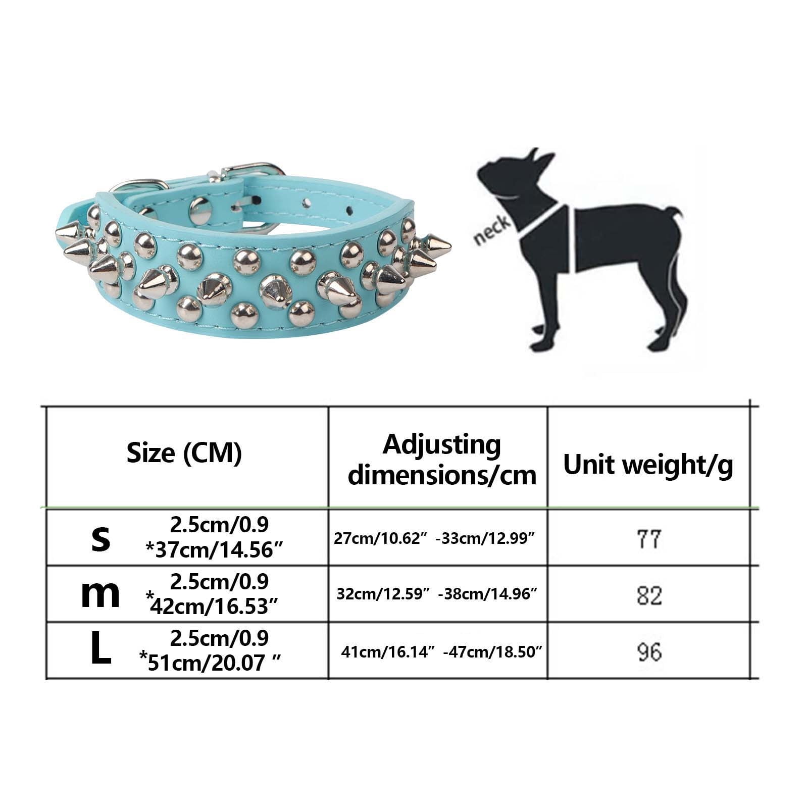 - 【Size】Please measure your dog’s neck carefully to confirm the correct size before ordering, to save your time and money. This adjustable spiked dog collar comes in 3 sizes, S is uesd for length 10.5-13″”(27-33cm), width 1″”/2.5cm,length 14.6/37cm;M is uesd for length 12.6-15″”(32-38cm), width 1″”/2.5cm,length 16.5″”/42cm ;L is uesd for length 16-18.5″”(41-47cm), width 1″”/2.5cm,length 20″”/51cm.
