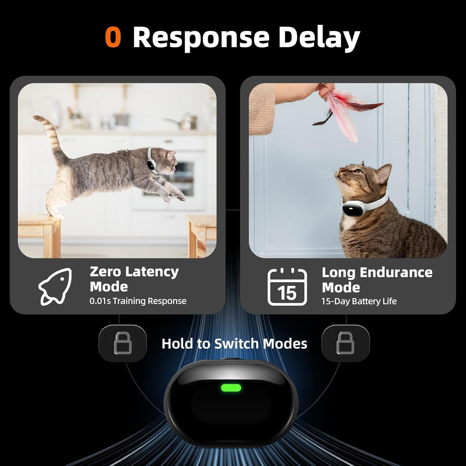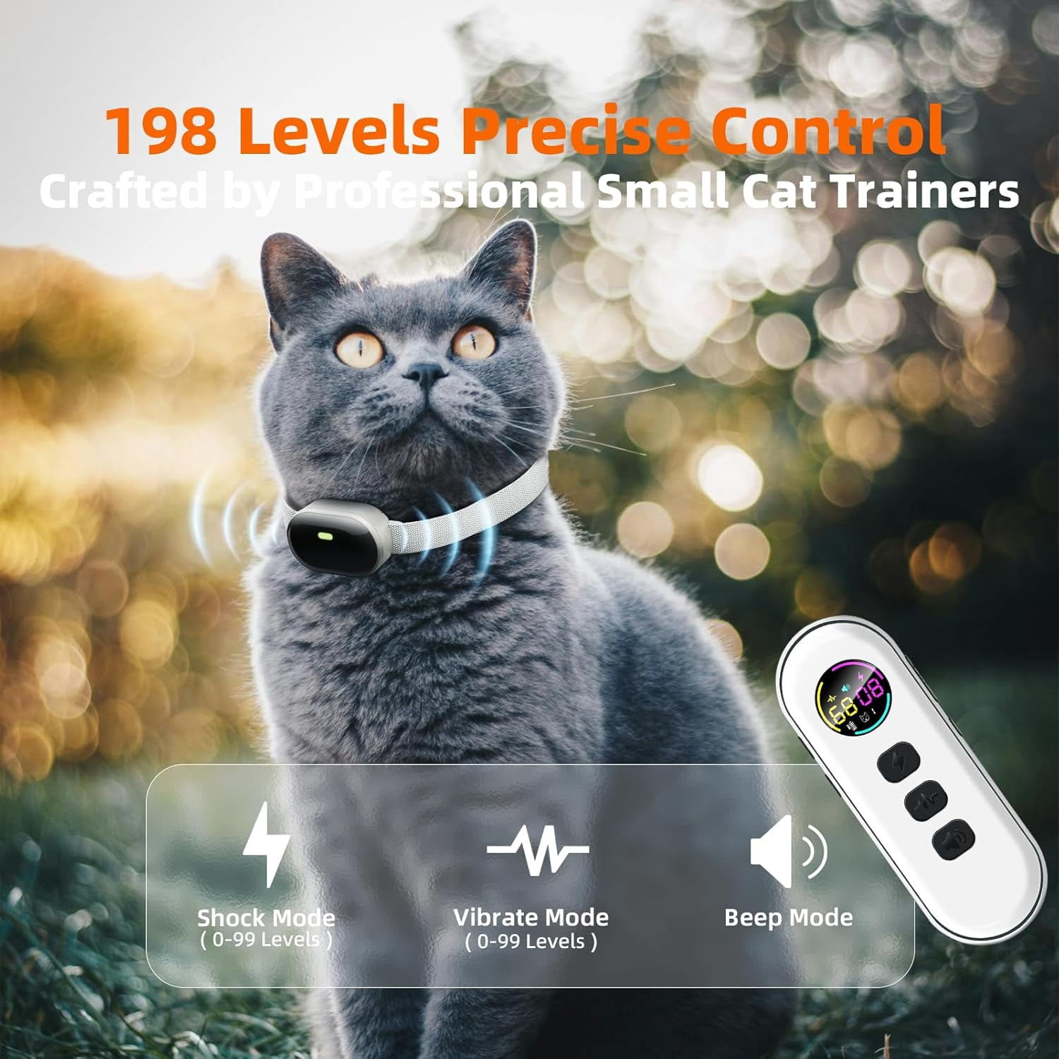 Ultra-Small/Light/Thin Design: The latest 2024 model, featuring an ultra-small/light/thin cat training collar, with dimensions of just 1*1.7*0.79in and a weight of only 0.8oz, perfect for cats of all sizes. Tailored for Cats: Suitable for cats with neck sizes from 6-19 inches, equipped with a breathable and adjustable woven strap for enhanced comfort. Innovative Training Modes: Offers a total of 198 adjustable levels for precise training, including sound, vibration, and shock modes. Features a one-press switch for zero latency mode and long endurance mode, effectively adapting to various training scenarios. Safe, Comfortable, and User-Friendly: The collar is designed with the highest safety standards, featuring a one-key lock to prevent accidental shocks. The protruding contact points can be easily removed for added comfort. Compact Size, Powerful Performance: Provides a stable signal range of 1300 feet, with a magnetic charging design ensuring a completely sealed collar for excellent waterproofing. Quick charge in 2 hours provides up to 15 days of battery life.
